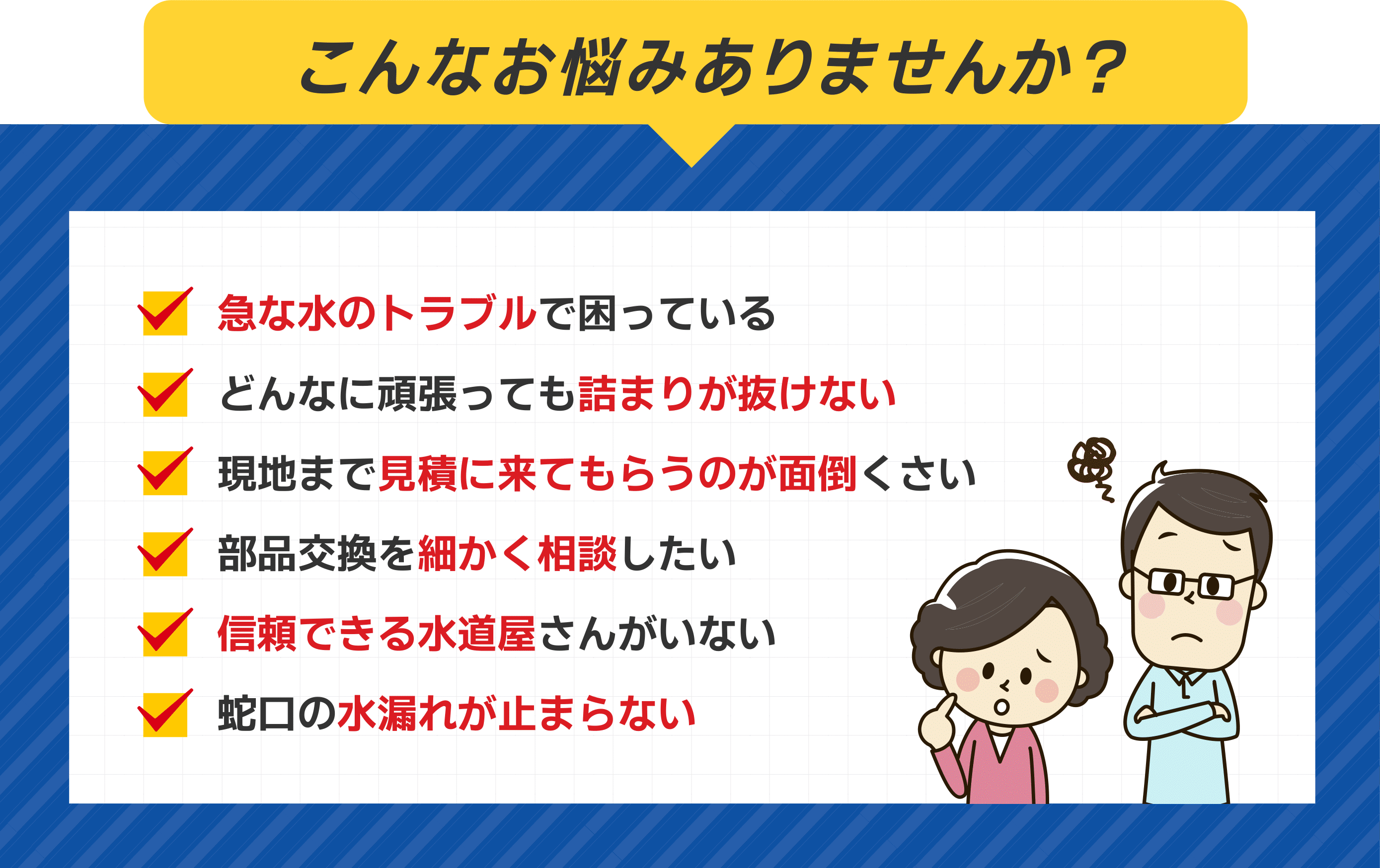 はい、対応可能です。弊社は水道局指定工事店の認可を得た正式な水道修理業者です。経験豊富な作業スタッフを揃え修理作業をおこなっておりますので「宅内・屋外の水回り修理」「各排水のつまり」「部品交換・本体交換」「リフォーム作業」など幅広く対応可能です。