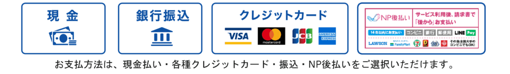 お客様のご希望に合わせてお選びいただけます。「現金支払い・お振込み・各種クレジットカード決済」をお選びいただけます。